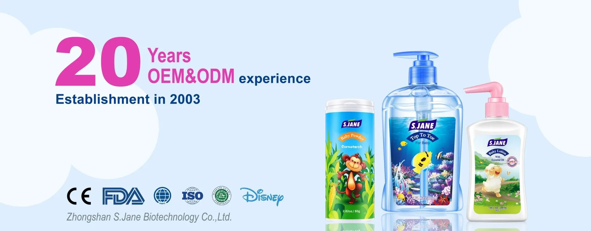 Zhongshan S. Jane Biotechnology Co., Ltd, established in 2003, is an experienced OEM/ODM supplier of baby care, personal skin care, hair care, daily use disinfectant and house hold cleansing etc.